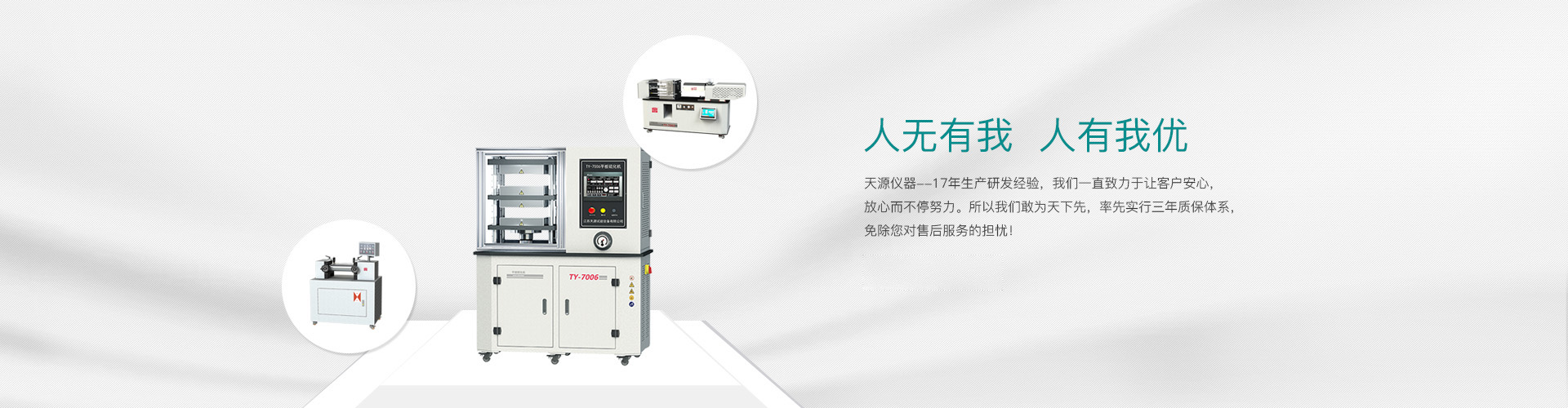 “江蘇天源”總投資約2600萬元,占地12000平方米,車間生產面積約5000平方米,辦公面積1500平方米,駐外辦事處5處,合作營銷點9處。 國家級高新技術企業“江蘇天源”擁有自營進出口權,并獲得30多項專利17個高新技術產品。我們本著中等價位,高端品質,無利高效的服務為理念,研發生產的電子萬能試驗機系列和橡塑高分子檢測儀器獲得了3500多家單位的賞識!